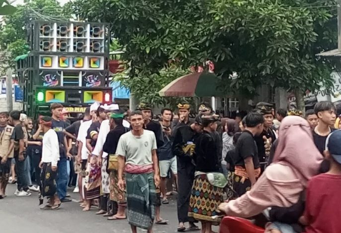 Terlihat iring-iringan warga dengan pakaian adat Sasak berjalan beriringan, mencerminkan kekompakan dan semangat gotong royong masyarakat.